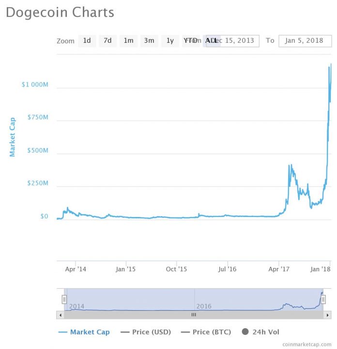 The capitalization of Dogecoin is more than 1 billion dollars. The picture shows a graph of the capitalization of DOGE.
